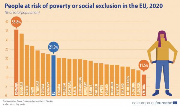 Πάνω από το ένα τέταρτο του πληθυσμού κινδύνευε από φτώχεια ή κοινωνικό αποκλεισμό σε τέσσερα κράτη μέλη με διαθέσιμα στοιχεία για το 2020: Ρουμανία (35,8%), Βουλγαρία (33,6%), Ελλάδα (27,5%) και Ισπανία (27,0%).