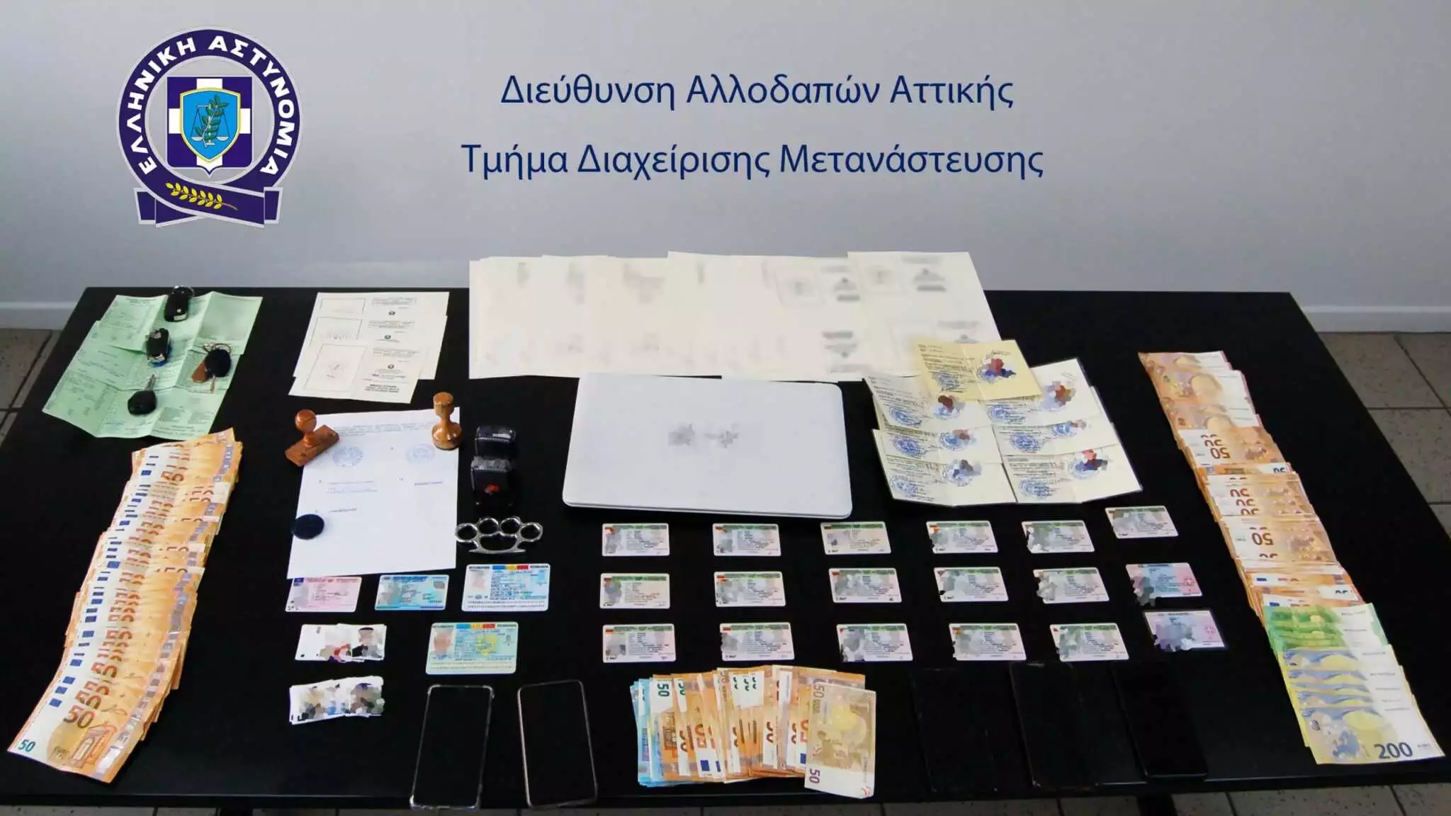 19 δελτία ταυτότητας, 7 πλαστές βεβαιώσεις εγγραφής πολίτη Ευρωπαϊκής Ένωσης, 41 υπό κατάρτιση πλαστά έντυπα βεβαιώσεων πολιτών Ε.Ε., 2 πλαστές άδειες διαμονής, 2 πλαστές αλλοδαπές άδειες ικανότητας οδήγησης, πλήθος πλαστών δικαιολογητικών και υπευθύνων δηλώσεων, 3 πλαστές στρογγυλές σφραγίδες, 2 σφραγίδες με στοιχεία υπαλλήλων, 6 κινητά τηλέφωνα, φορητός υπολογιστής, 650 ευρώ και 6 οχήματα.