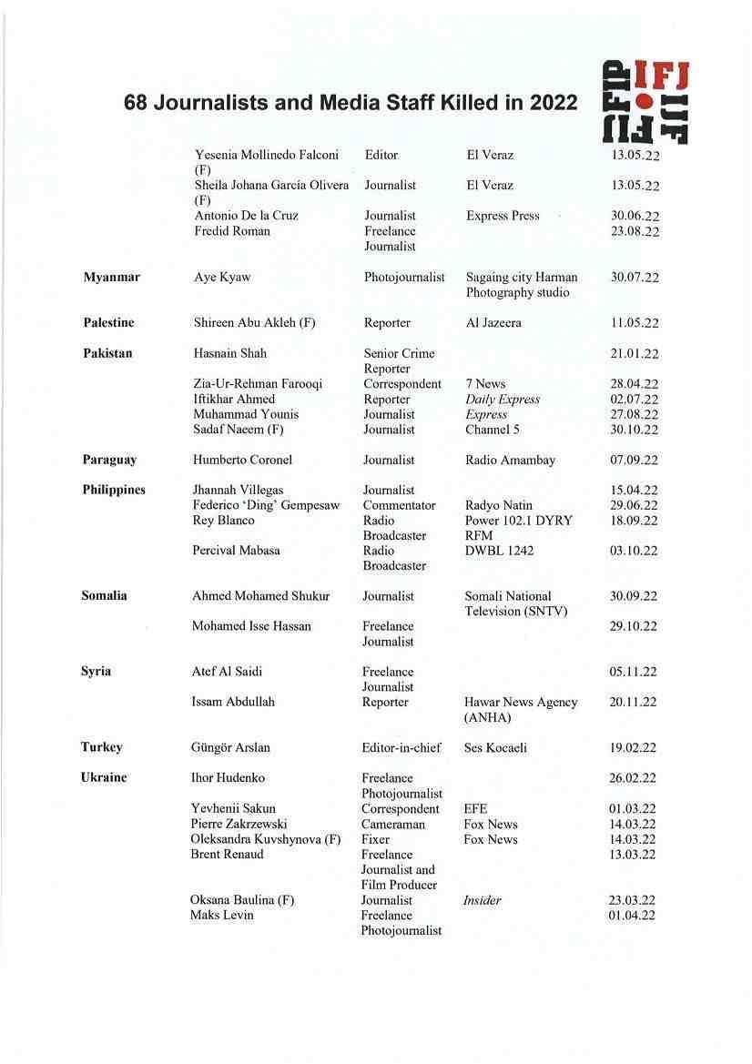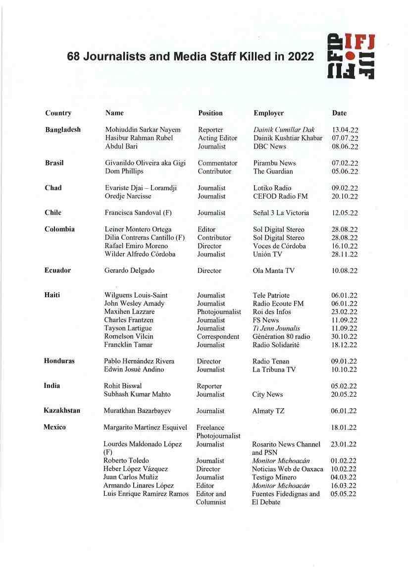 Ακολουθεί η λίστα της ΔΟΔ με τους δημοσιογράφους που δολοφονήθηκαν το 2022: