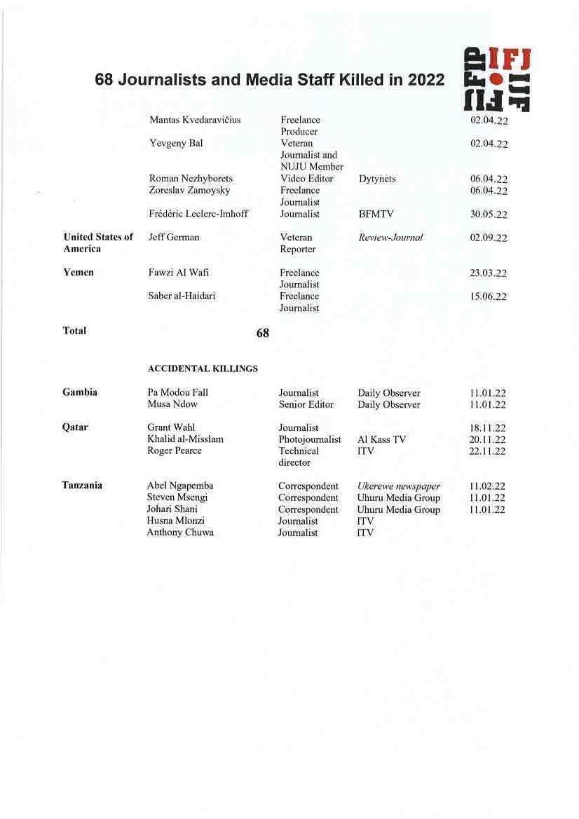 Η ΔΟΔ έχει καταγράψει 68 δολοφονίες δημοσιογράφων και εργαζόμενων ΜΜΕ κατά τη διάρκεια του 2022, έναντι 47 το 2021 και τα τελευταία χρόνια καταγραφόταν πτώση του αριθμού των δολοφονιών. Υπήρξαν, επίσης, 11 θάνατοι που σχετίζονταν με ατυχήματα και ασθένειες, συμπεριλαμβανομένων τριών δημοσιογράφων και εργαζομένων ΜΜΕ που απεβίωσαν ενώ έκαναν ρεπορτάζ για το Παγκόσμιο Κύπελλο 2022 στο Κατάρ.