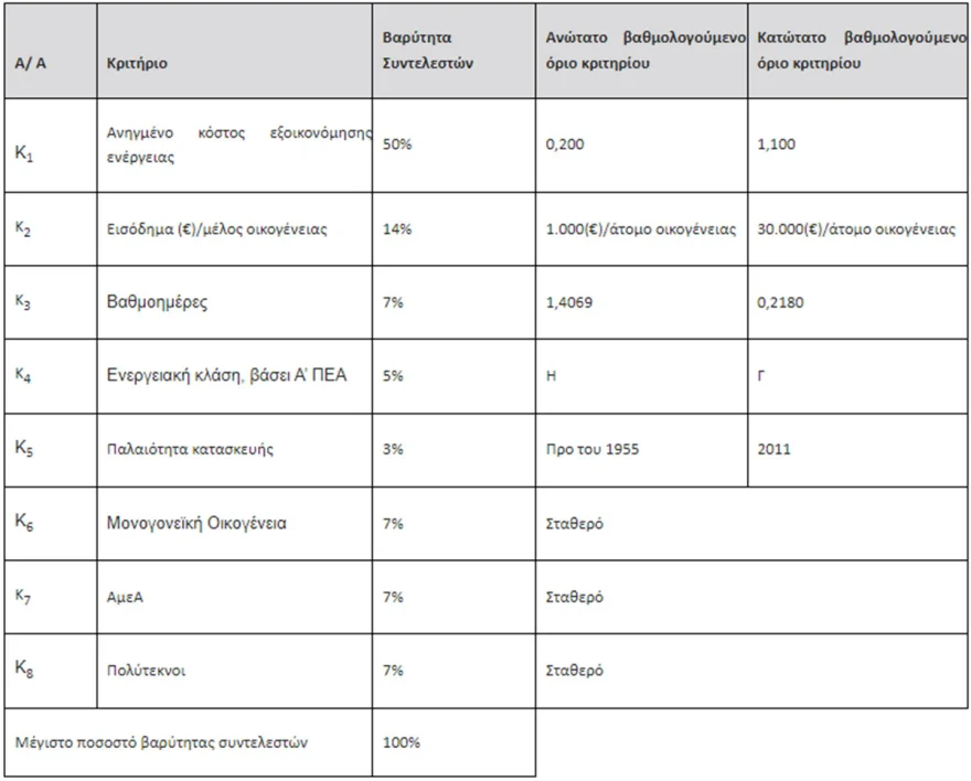 – Υφίσταται νόμιμα. – Μην έχει κριθεί κατεδαφιστέο. – Χρησιμοποιείται ως κύρια κατοικία. – Να έχει καταταγεί σε κατηγορία ενεργειακής κλάσης χαμηλότερη ή ίση της Γ΄, βάση του Πιστοποιητικού Ενεργειακής Απόδοσης (ΠΕΑ).