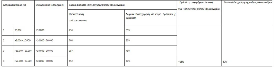 Το ποσοστό της επιδότησης είναι κλιμακωτό, ανάλογα με την εισοδηματική κατηγορία στην οποία θα ενταχθεί ο αιτών και ορίζεται ως εξής: