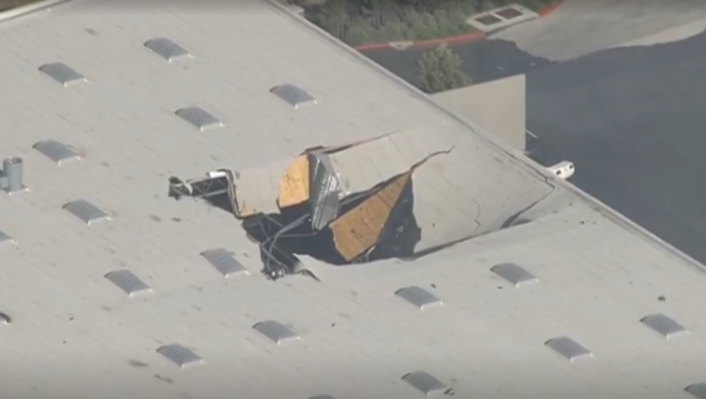 Φωτογραφία που εικονίζει ένα μεγάλο γκρίζο κτίριο με μια τρύπα στην οροφή.