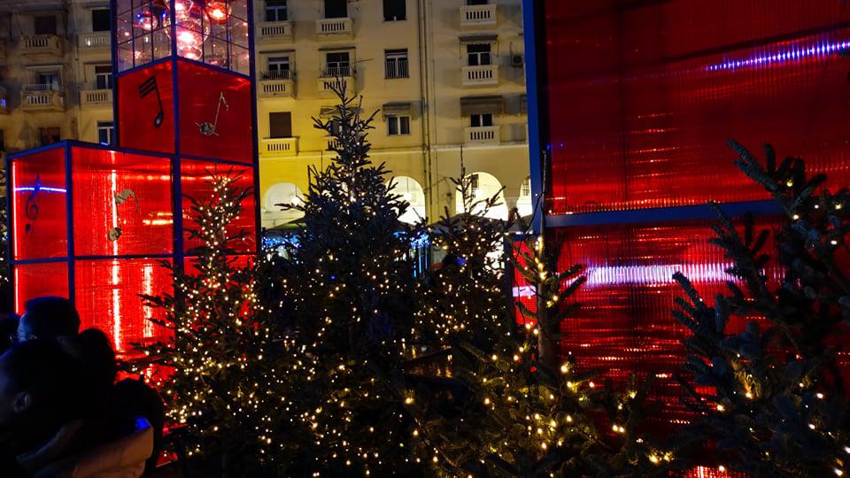 Ξεχωριστή ατμόσφαιρα δημιούργησε η Φιλαρμονική Ορχήστρα του Δήμου Θεσσαλονίκης με τις χριστουγεννιάτικες μελωδίες της, καθώς και οι κόκκινοι πύργοι της πλατείας, που διαθέτουν φωτιστικό εξοπλισμό που ρυθμίζεται κεντρικά, με αποτέλεσμα τη συγχρονισμένη κίνηση φωτός.