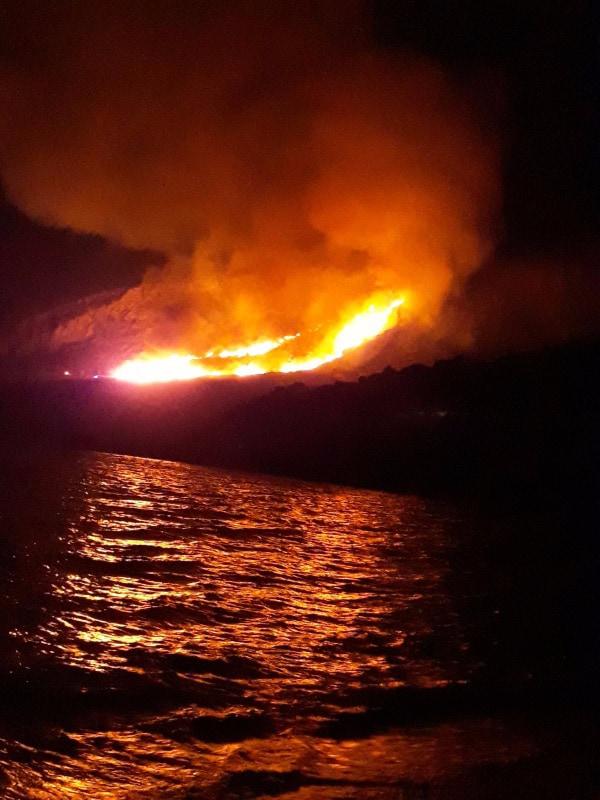 Το έργο της Πυροσβεστικής δυσκολεύει το γεγονός ότι είναι νύχτα και το μέτωπο της φωτιάς είναι σε βραχώδες και μη εύκολα προσπελάσιμο σημείο.