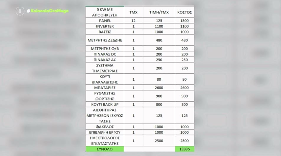 Φωτοβολταϊκά πλαισίων, αντιστροφέα, πίνακες, καλώδια κτλ Συστήματος βάσεων Μετρητή Συστήματος αποθήκευσης Αμοιβή για μελέτη – διαστασιολόγηση του συστήματος και εργασίες εγκατάστασης
