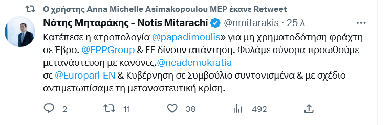 Η ευρωβουλευτής της ΝΔ Άννα-Μισέλ Ασημακοπούλου σε ανάρτησή της στο Τwitter αναφέρει: