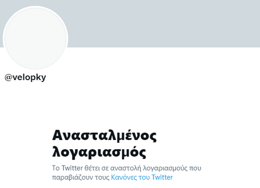 To Τwitter ανέστειλε τον λογαριασμό του προέδρου της Ελληνικής Λύσης, Κυριάκου Βελόπουλου.