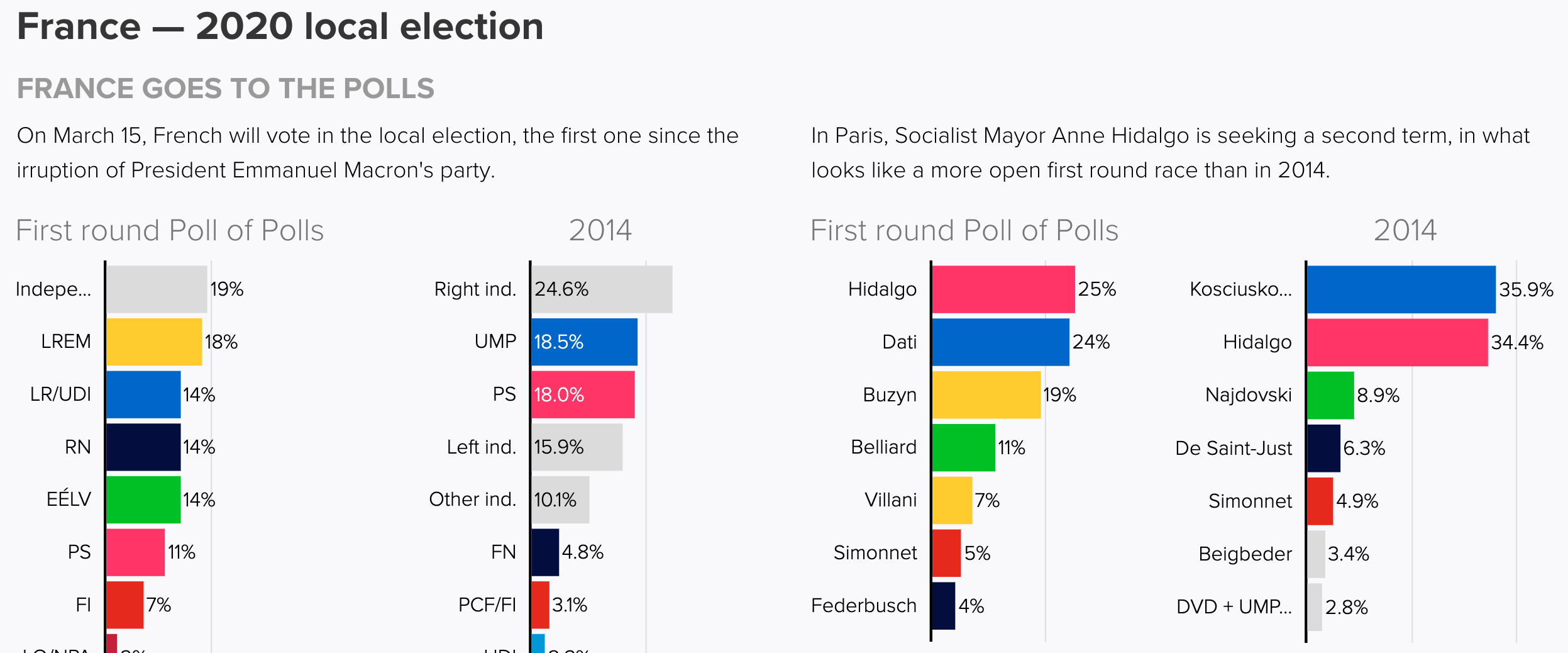 Το μεγαλύτερο έπαθλο είναι φυσικά το Παρίσι, όπου σύμφωνα με τις δημοσκοπήσεις τις δύο πρώτες θέσεις μοιράζονται η απερχόμενη σοσιαλίστρια δήμαρχος Αν Ινταλγκό και η πρώην υπουργός Δικαιοσύνης, η συντηρητική Ρασιντά Ντατί. Οι δύο γυναίκες αναμένεται να περάσουν στον δεύτερο γύρο.