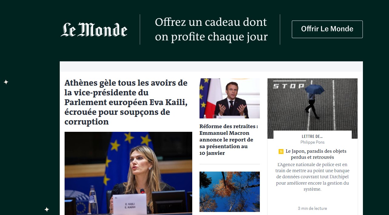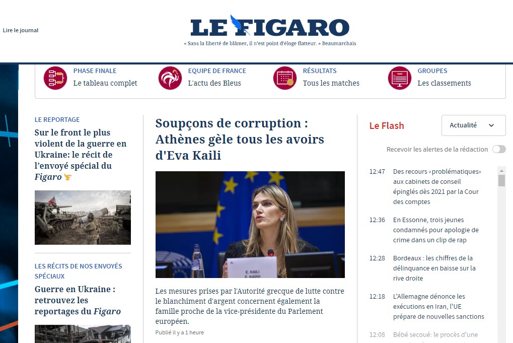Εκτενής είναι η κάλυψη στον γαλλικό Τύπο του σκανδάλου διαφθοράς στο Ευρωπαϊκό Κοινοβούλιο, στο οποίο εμπλέκεται η αντιπρόεδρός του Εύα Καϊλή. Σκάνδαλο διαφθοράς στο Ευρωπαϊκό Κοινοβούλιο: 4 άτομα τα οποία κατηγορούνται φυλακίστηκαν, μεταξύ των οποίων και η αντιπρόεδρος Εύα Καϊλή» είναι ο τίτλος σχετικού δημοσιεύματος στην εφημερίδα Le Figaro όπου αφού εξιστορούνται τα όσα συνέβησαν την Παρασκευή στις Βρυξέλλες, υπογραμμίζεται ότι «το Ευρωπαϊκό Κοινοβούλιο βρίσκεται στο επίκεντρο ενός σκανδάλου διαφθοράς, με περίπου 20 εφόδους και έξι συλλήψεις στις Βρυξέλλες και άλλες δύο στην Ιταλία.