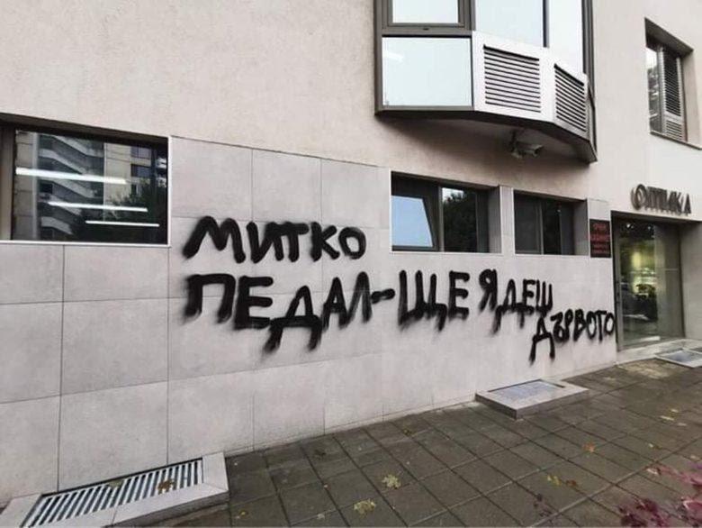 Σε ένα άλλο κτίριο – εκείνο του χώρου εργασίας του Dimitar Dimitrov – ενός από τους διοργανωτές της διαμαρτυρίας εμφανίστηκε: «Mitko – fagot – θα δαγκώσεις το ξύλο». Οι απειλές είναι γραμμένες με μαύρο σπρέι με μεγάλα γράμματα και είναι ορατές από μακριά.