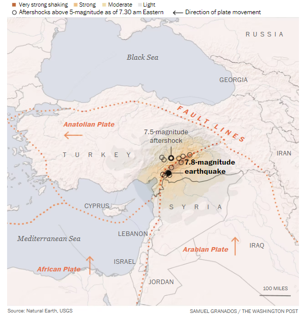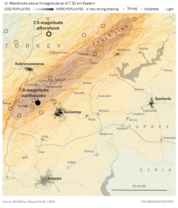 Ο σεισμός των 7,8 βαθμών έχει μέχρι στιγμής σκοτώσει περισσότερους από 5.000 ανθρώπους στην Τουρκία και τη γειτονική Συρία, ενώ ο αριθμός αναμένεται να αυξηθεί. Προκάλεσε επίσης δεκάδες καταστροφικούς μετασεισμούς.