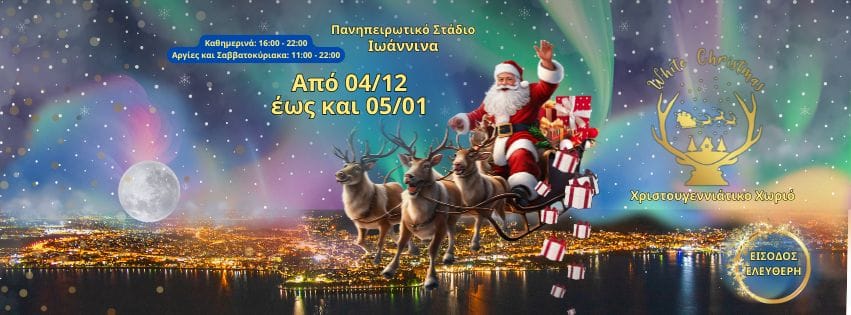 🎅✨Το πιο παραμυθένιο “White Christmas” επιστρέφει στα Ιωάννινα!🎄❄️ Από 4 Δεκεμβρίου 2024 έως 7 Ιανουαρίου 2025, το Πανηπειρωτικό Στάδιο Ιωαννίνων μεταμορφώνεται σε ένα τεράστιο χριστουγεννιάτικο χωριό! Είσαι έτοιμος να ζήσεις την πιο μαγική εμπειρία της χρονιάς; 😍 …………………………………………………………………………………………………………….. 🎡 Τι σε περιμένει; 🎅 Ένας γιγαντιαίος Άη Βασίλης έτοιμος για φωτογραφίες! ⛸️ Στεγασμένο παγοδρόμιο 500τ.μ. για απίθανες φιγούρες στον πάγο. 🌟 Το Χωριό του Αϊ-Βασίλη και το εντυπωσιακό Χριστουγεννιάτικο Καρουζέλ. 🍭 Λαχταριστές λιχουδιές που μυρίζουν Χριστούγεννα! ⚡ Hado: Εικονική πραγματικότητα, για πρώτη φορά στα Ιωάννινα! ❄️ Πίστα για χιονοπόλεμο, για παιχνίδι χωρίς… παγωνιά. 🎠 Ένα μεγάλο λούνα παρκ γεμάτο παιχνίδια και διασκέδαση για όλες και όλους. 🌬️ Φυσικά, θα υπάρξει και ένας ζεστός χώρος με θέρμανση, στον οποίο μπορείς να απολαύσεις την ζεστή σου σοκολάτα άμα είσαι μικρός ή το ζεστό σου κρασί άμα είσαι λίγο μεγαλύτερος, καθώς και το φαγητό που προτιμάς! Το “White Christmas” περιμένει να το ανακαλύψεις! Μην το χάσεις!