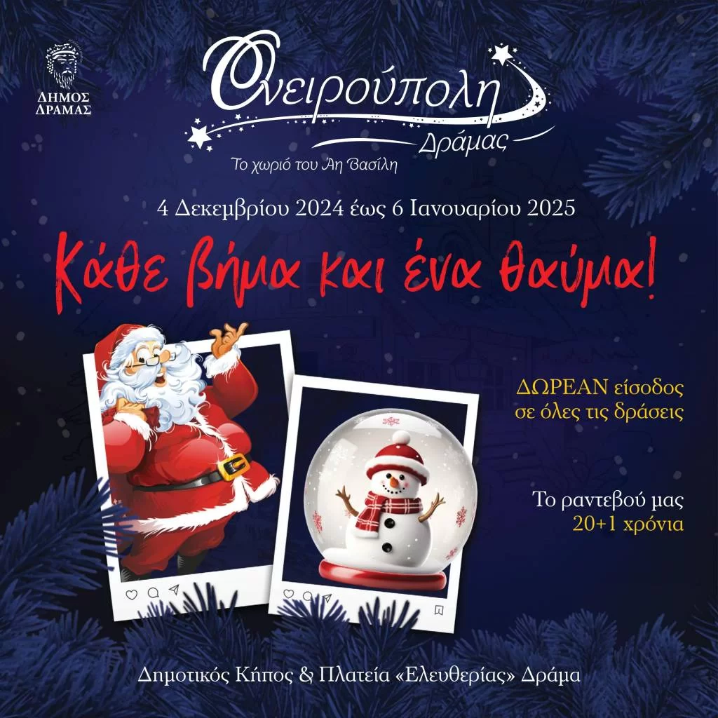 Η«Ονειρούπολη» 2024-2025, το χωριό του Αη Βασίλη στην πανέμορφη πόλη της Δράμας, θα ανοίξει τις πύλες της την Τετάρτη 4 Δεκεμβρίου 2024 πανέτοιμη να υποδεχτεί όλους τους φίλους της για να ζήσουν ξανά μαγικές στιγμές, να ανταλλάξουν γέλια, να απολαύσουν συναυλίες από αγαπημένους καλλιτέχνες και να περιπλανηθούν ανάμεσα στα σπιτάκια των δραστηριοτήτων.