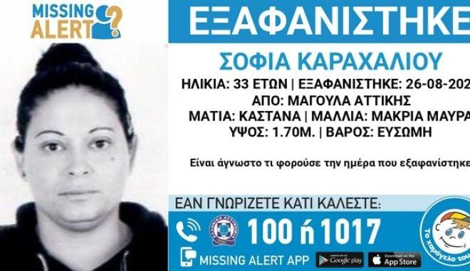 Στις 26 Αυγούστου, πρωινές ώρες, εξαφανίστηκε από την περιοχή της Μαγούλας στην Αττική, η Σοφία Καραχάλιου, 33 ετών. Το «Χαμόγελο του Παιδιού» ενημερώθηκε στις 6 Σεπτεμβρίου και το Σάββατο (09/09) προχώρησε στη δημοσιοποίηση των στοιχείων της ενήλικης, κατόπιν αιτήματος της οικογένειας της, καθώς συντρέχουν λόγοι, οι οποίοι θέτουν τη ζωή της σε κίνδυνο.