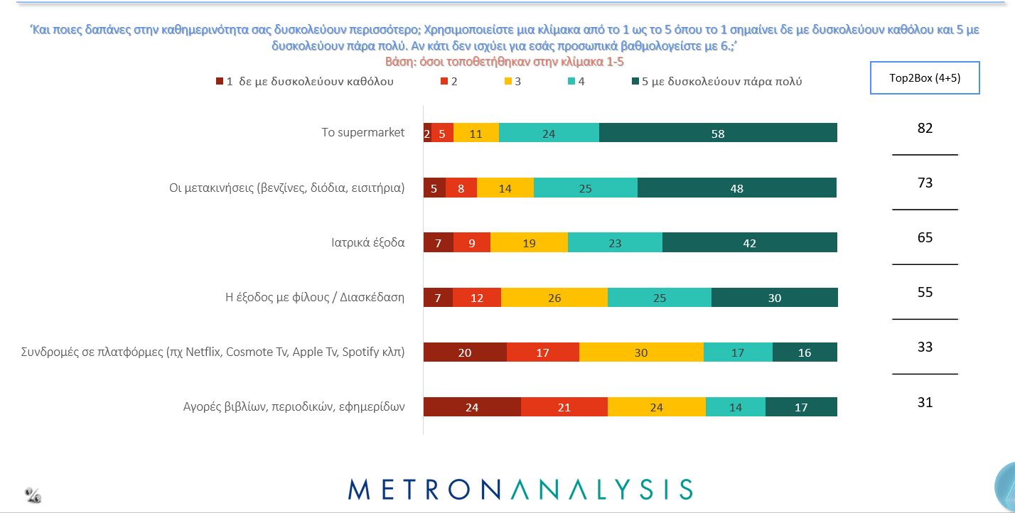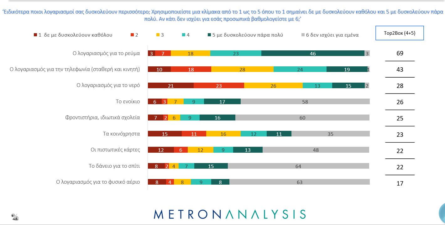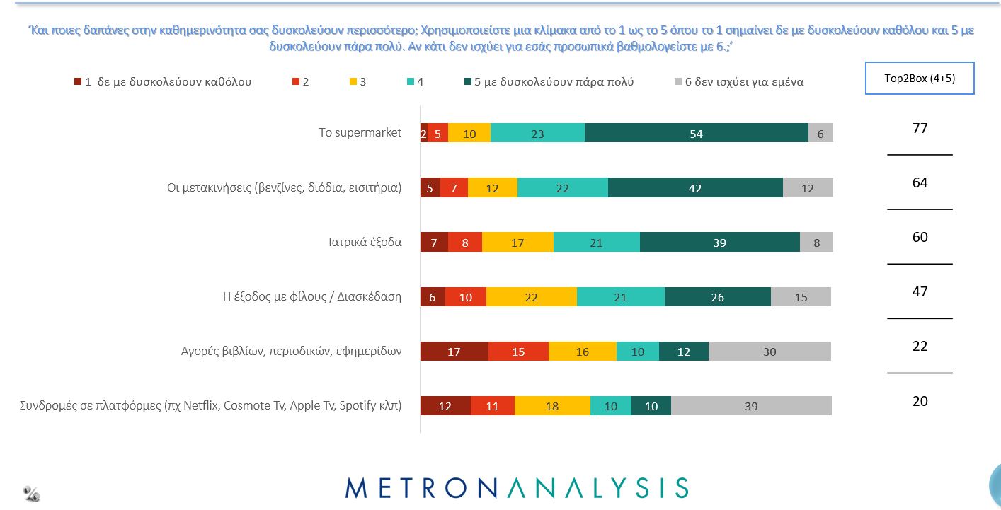 Για τους περισσότερους ερωτηθέντες αυτό που βαραίνει περισσότερο είναι οι καθημερινές δαπάνες παρά οι μηνιαίοι λογαριασμοί.