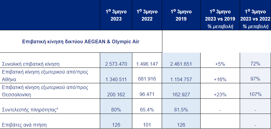 Με την συνολική επιβατική κίνηση της AEGEAN για το 1ο τρίμηνο του έτους 72% υψηλότερα από το 2022 (2.6 εκατ. επιβάτες) άλλα και για πρώτη φορά να ξεπερνά την αντίστοιχη του 2019 (+5% αύξηση), και την επιβατική κίνηση εξωτερικού από τα δυο μεγαλύτερα αεροδρόμια της χώρας (Αθήνα, Θεσσαλονίκη) να καταγράφει σχεδόν διπλασιασμό (+ 98%) και σημαντική αύξηση +17% από το 2019, ολοκληρώθηκε η χειμερινή περίοδος αντικατοπτρίζοντας την επένδυση της εταιρείας στο πιο αδύναμο τρίμηνο του έτους, αλλά και τις θετικές προοπτικές για τη ζήτηση προς τη χώρα, πριν ακόμη από το ξεκίνημα της κύριας τουριστικής περιόδου.