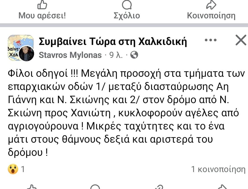 Συγκεκριμένα, οι καταγγελίες αναφέρουν αγέλες να κάνουν την εμφάνισή τους σε τμήματα των Επαρχιακών οδών 1, μεταξύ της διασταύρωσης Άη Γιάννη και Ν. Σκιώνης και 2, στον δρόμο από Ν. Σκιώνη προς Χανιώτη.