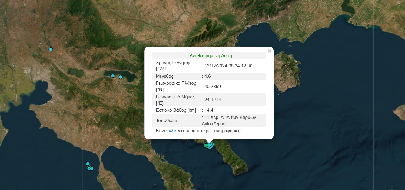 Στις 10:34 καταγράφηκε δόνηση 4,7 βαθμών της κλίμακας Ρίχτερ, σύμφωνα με το Σεισμολογικό Σταθμό του ΑΠΘ, ενώ από την πλευρά του το Γεωδυναμικό Ινστιτούτο τον καταγράφει 4,6.