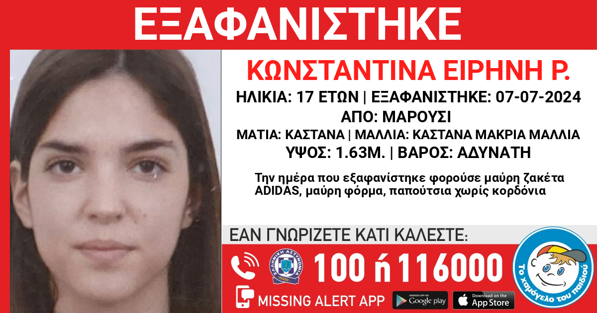 Την κινητοποίηση των Αρχών έχει προκαλέσει η εξαφάνιση της 17χρονης Κωνσταντίνας από το Μαρούσι.