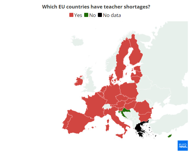 Μόνο η Κροατία και η Κύπρος δεν ανέφεραν έλλειψη εκπαιδευτικού προσωπικού, σύμφωνα με την έκθεση Education and Training Monitor 2023 της Ευρωπαϊκής Επιτροπής, ενώ τα υπάρχοντα δημόσια δεδομένα της Ελλάδας δεν της επιτρέπουν να αξιολογήσει εάν καλύπτονται όλες οι ανάγκες ή εάν συγκεκριμένα μαθήματα ενδέχεται να υποστούν ελλείψεις.