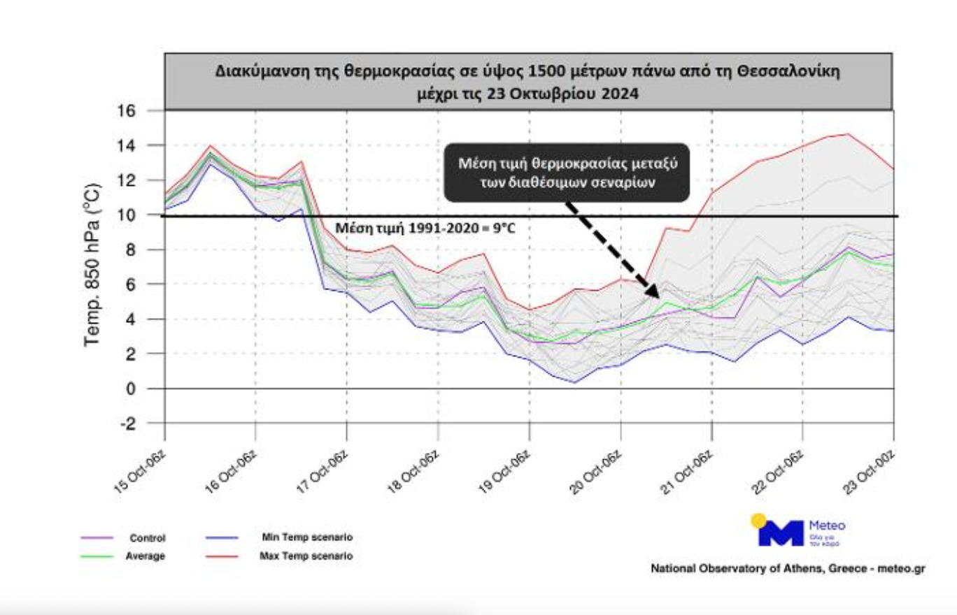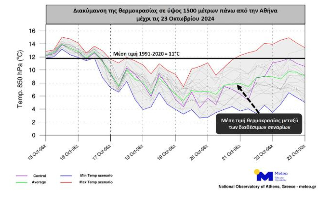 Στην εικόνες που ακολουθούν παρουσιάζεται ενδεικτικά το εύρος διακύμανσης της θερμοκρασίας έως τις 23/10 σε ύψος 1500 περίπου μέτρων επάνω από την Αθήνα και τη Θεσσαλονίκη. Με την κόκκινη γραμμή παρουσιάζεται το «θερμότερο» σενάριο ενώ με τη μπλε γραμμή το «ψυχρότερο» σενάριο. Με πράσινη γραμμή παρουσιάζεται η διακύμανση της μέσης θερμοκρασίας με βάση όλα τα διαθέσιμα σενάρια του μοντέλου. Τέλος, με την μαύρη οριζόντια γραμμή σημειώνεται η προσεγγιστική μέση τιμή της εποχής σύμφωνα με δεδομένα της περιόδου 1991-2020. Όπως γίνεται εμφανές, όλα σχεδόν τα σενάρια δίνουν θερμοκρασίες χαμηλότερες συγκριτικά με τις κανονικές για την εποχή.