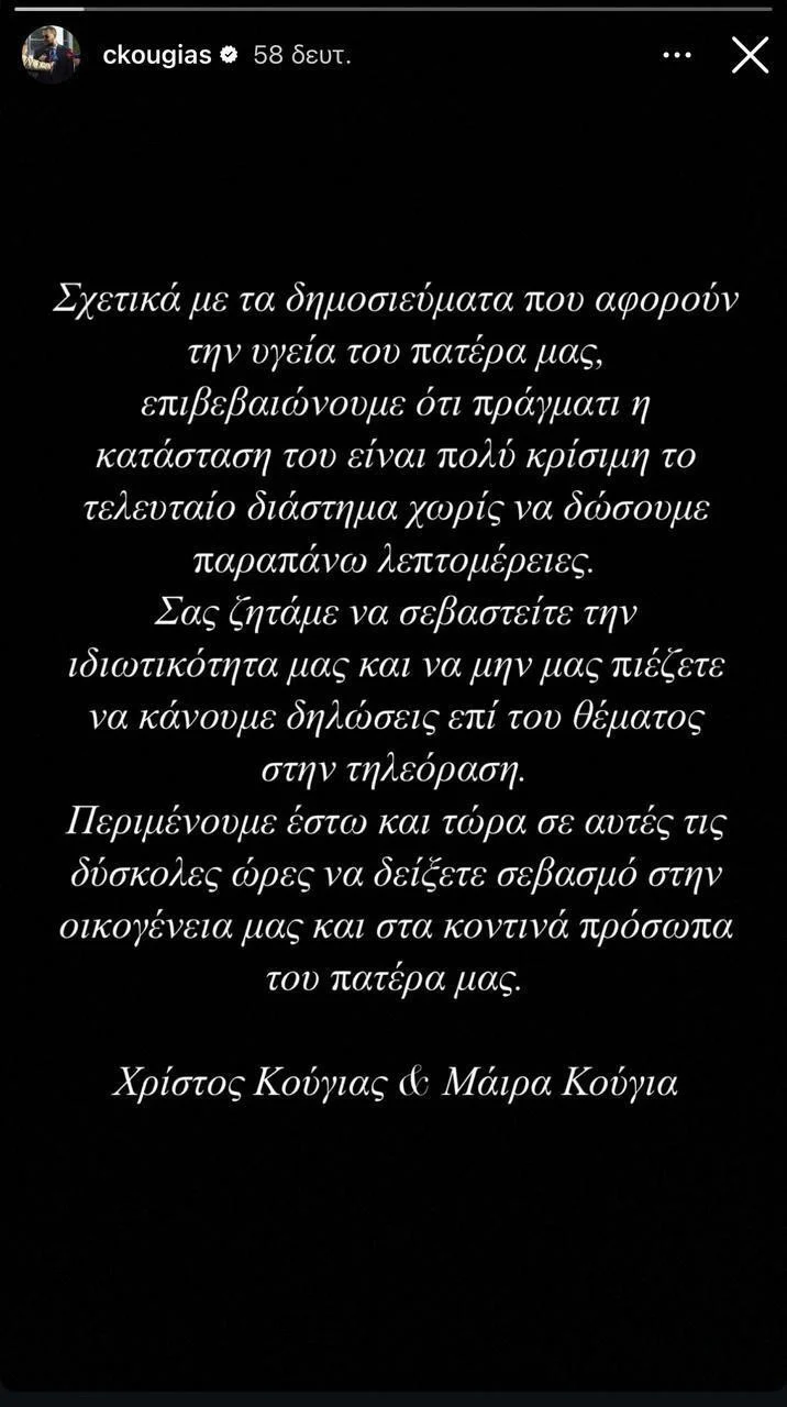 Την κακή κατάσταση της υγείας του Αλέξη Κούγια επιβεβαίωσαν τα δύο του παιδιά, Χρίστος και Μάιρα, με ανάρτησή τους στα social media.