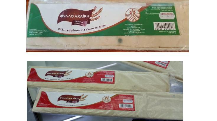Πρόκειται για το προϊόν “ΦΥΛΛΟ ΑΧΑΪΚΗ – Φύλλο Κρούστας για Γλυκά και Πίτες”, σε συσκευασία των 250g και 500g, με ημερομηνία λήξης 30/9/19. Το προϊόν παράγεται από την εταιρεία ΦΥΛΛΟ ΑΧΑΪΚΗ Ο.Ε. με έδρα στη Σολωμού 27, Δεμένικα, Πάτρα.