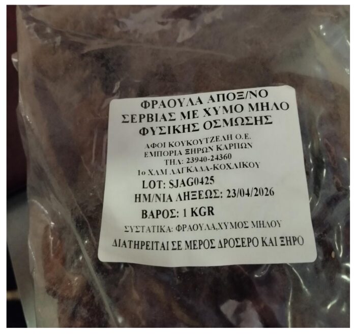Το Τμήμα Εμπορίου της Δ/νσης Ανάπτυξης της Περιφερειακής Ενότητας Ξάνθης στο πλαίσιο προγράμματος συνεργασίας με τον ΕΦΕΤ έτους 2025 για τον έλεγχο προσθέτων τροφίμων και αρωματικών ουσιών σε διάφορα είδη τροφίμων, προέβη σε δειγματοληψία τροφίμου με στοιχεία «Φράουλα αποξηραμένη με χυμό μήλου φυσικής όσμωσης» προέλευσης Σερβίας σε πλαστική κλειστή συσκευασία 1Kg, με αριθμό παρτίδας SJAG0425, ανάλωση κατά προτίμηση πριν από: 23/04/2026, που διατίθεται από την επιχείρηση «ΑΦΟΙ ΚΟΥΚΟΥΤΖΕΛΗ Ο.Ε.» με έδρα στον 1ο χλμ Λαγκαδά-Κολχικού.