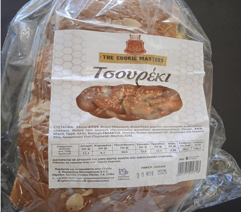 Ο Ε.Φ.Ε.Τ. και ειδικότερα η Περιφερειακή Διεύθυνση Πελοποννήσου, στο πλαίσιο του Προγράμματος «Επίσημος Έλεγχος για την Παρακολούθηση των Επιπέδων Προσθέτων Τροφίμων και Αρωματικών Ουσιών σε Τρόφιμα», προέβη σε δειγματοληψία τροφίμου με τα στοιχεία: «Τσουρέκι – THE COOKIE MASTERS» με ημερομηνία ανάλωσης κατά προτίμηση πριν από τις 20/11/25, συσκευασίας καθαρού βάρους 480g, το οποίο παράγεται και συσκευάζεται στην Ελλάδα από την Δ. ΓΟΥΡΓΟΥΛΗΣ Μον. Ε.Π.Ε. που εδρεύει στη Ζαχάρω Ηλείας.