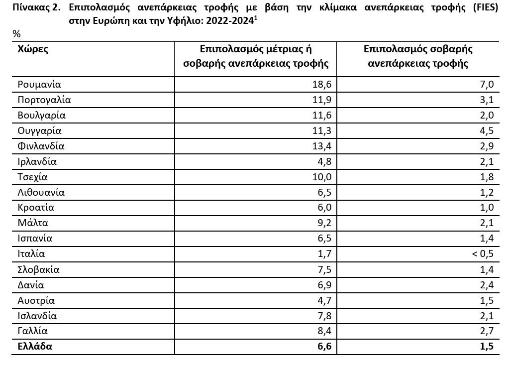 Στη χειρότερη θέση της ευρωπαϊκής κατάταξης βρίσκεται η Ρουμανία με το 18,6% των πολιτών να αντιμετωπίζουν μέτρια ή σοβαρή ανεπάρκεια τροφής και έπονται η Πορτογαλία με 11,9%, η Βουλγαρία με 11,6% και η Ουγγαρία με 11,3%.