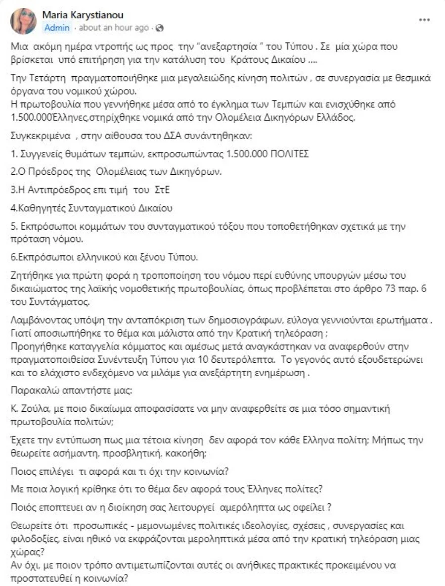 «Ημέρα ντροπής» για την ανεξαρτησία του Τύπου, χαρακτηρίζει η πρόεδρος του Συλλόγου Συγγενών Θυμάτων Τεμπών Μαρία Καρυστιανού το.. σιωπητήριο της δημόσιας τηλεόρασης στη συνέντευξη Τύπου που δόθηκε στον ΔΣΑ, επ’ αφορμή της συλλογής 1.500.000 υπογραφών Ελλήνων πολιτών, που ζήτησαν την τροποποίηση του νόμου περί ευθύνης υπουργών μέσω του δικαιώματος της λαϊκής νομοθετικής πρωτοβουλίας, όπως προβλέπεται στο άρθρο 73 παρ. 6 του Συντάγματος.