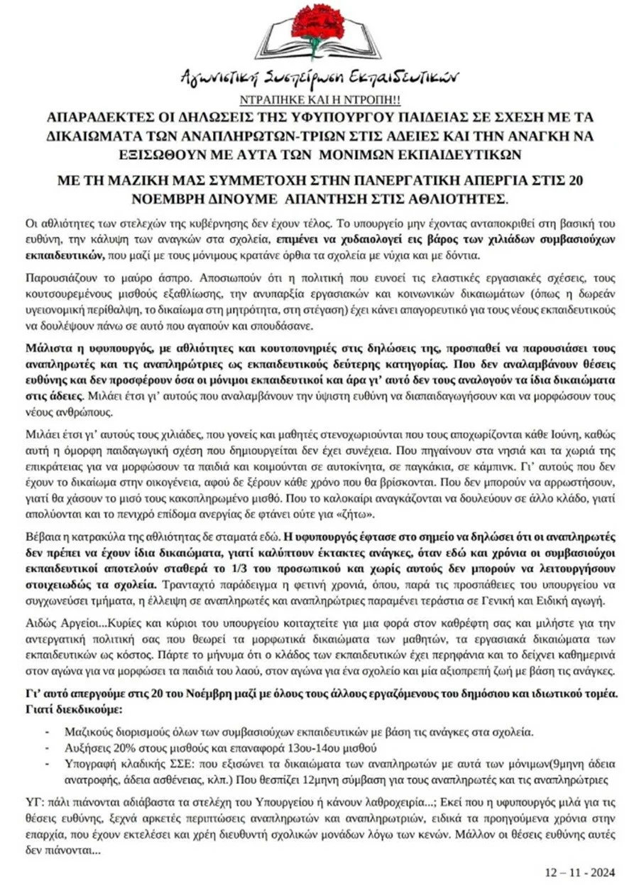 - την πραγματοποίηση 24ωρης Γενικής Απεργίας για την Τετάρτη 20 Νοεμβρίου 2024