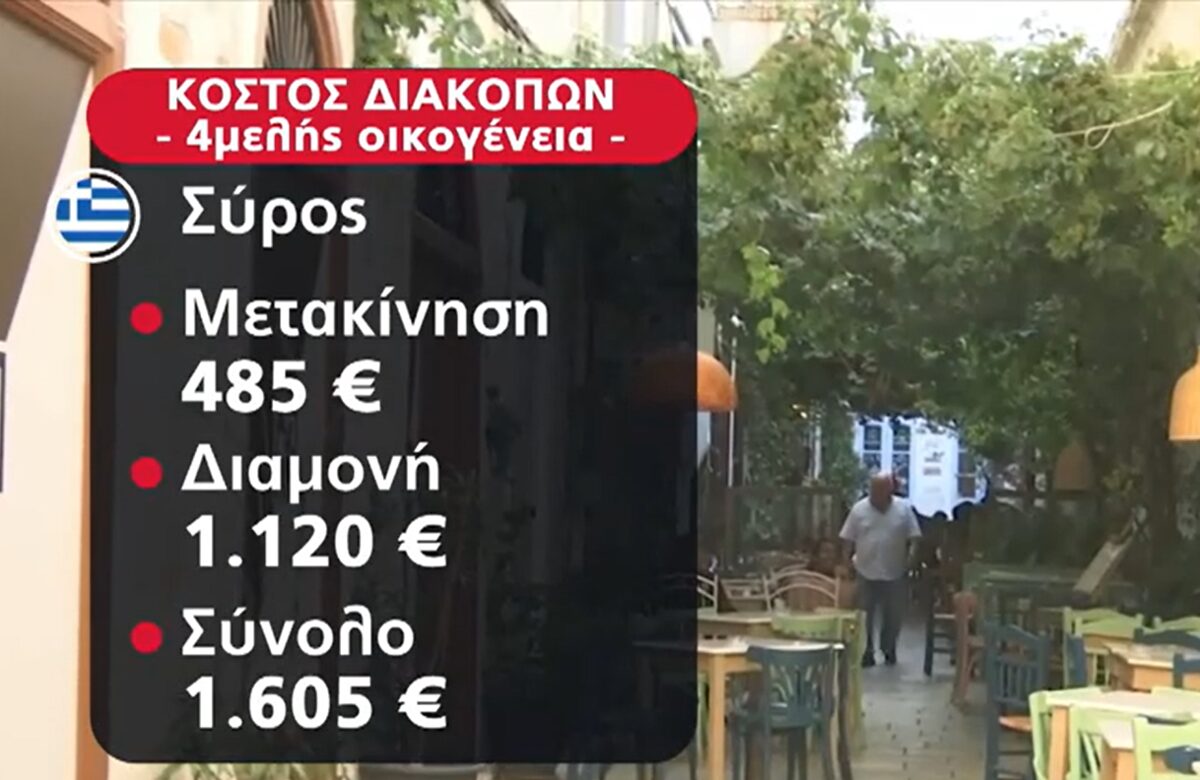 Σε ένα δεύτερο παράδειγμα μία 4μελής οικογένεια ήθελε να περάσει μία εβδομάδα στη Σύρο, θα έπρεπε να ξοδέψει 1.605 ευρώ. Τα ακτοπλοϊκά θα κόστιζαν 485 ευρώ ενώ απαιτούνται ακόμα 1.120 ευρώ για τη διαμονή.