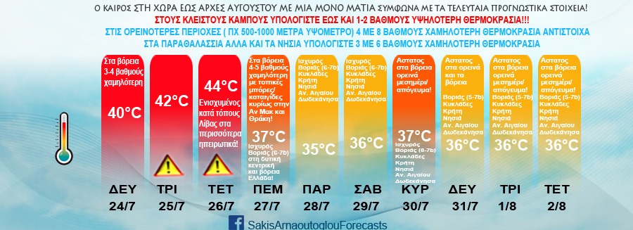 Στα ύψη θα παραμείνει ο υδράργυρος και τις επόμενες ημέρες στη χώρα με τον μετεωρολόγο της ΕΡΤ, Σάκη Αρναούτογλου, να χαρακτηρίζει την ερχόμενη Τετάρτη ως την πιο επικίνδυνη καιρικά μέρα από πλευράς καύσωνα και λίβα.
