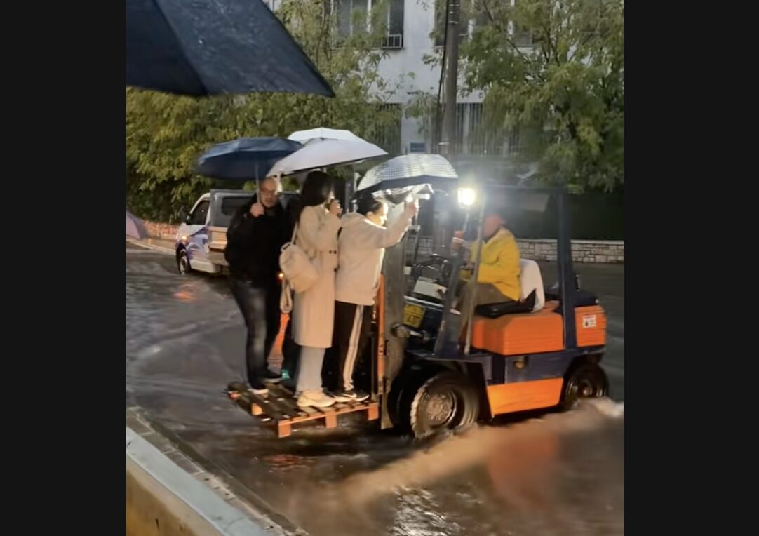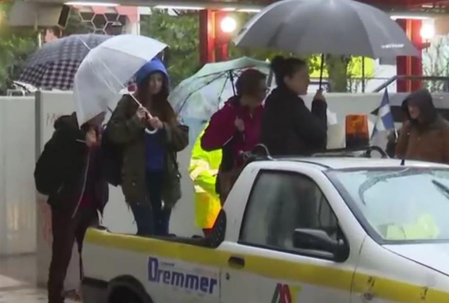 Όπως φαίνεται σε βίντεο του ΣΚΑΪ, ένα όχημα του δήμου βρίσκεται έξω από τον σταθμό και μεταφέρει πέντε πέντε τους πολίτες από το ένα πεζοδρόμιο στο άλλο, μια και ο δρόμος έχει γίνει «ποτάμι».