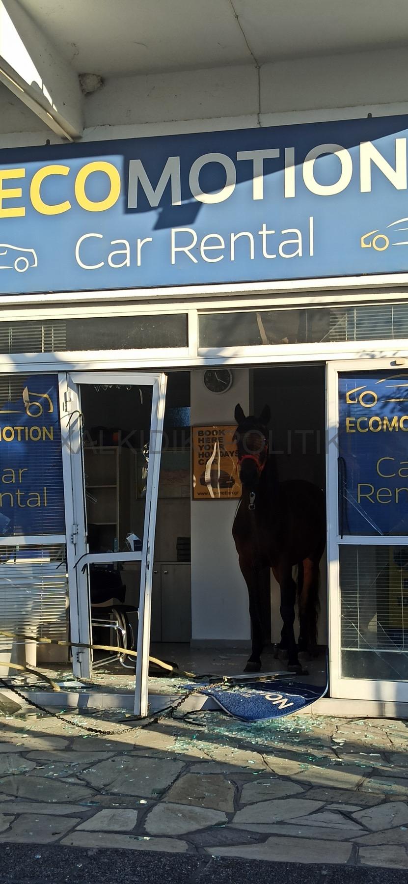 Όπως φαίνεται στις φωτογραφίες του XalkidikiPolitiki άλογο τα έκανε γυαλιά καρφιά σε κατάστημα ενοικιαζομένων αυτοκινήτων στη Νικήτη.