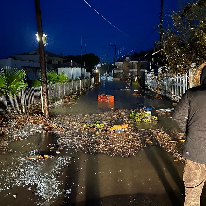 Επιπλέον, υπερχείλισε και το ρέμα που διέρχεται την Τορώνη με αποτέλεσμα να πλημμυρίσουν δρόμοι και σπίτια στον οικισμό.