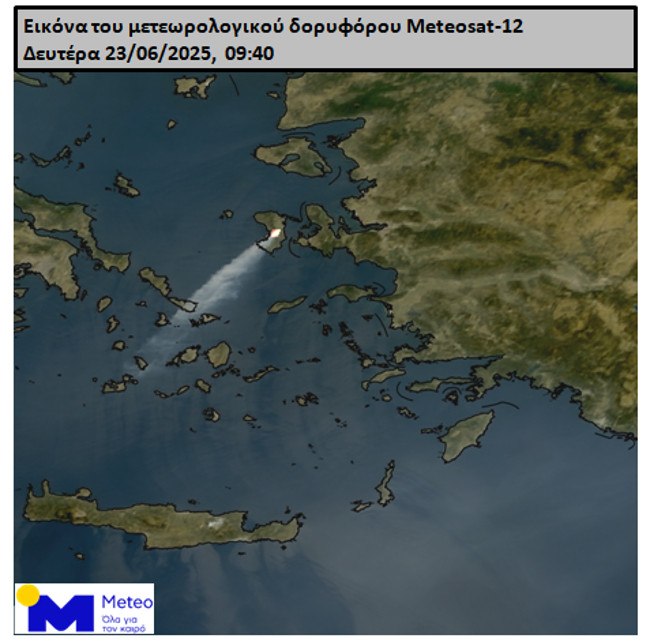 Στην ψευδοχρωματισμένη εικόνα του δορυφόρου από τις 09:40 της Δευτέρας 23/06 φαίνεται ο ότι καπνός από την φωτιά της Χίου εκτείνεται από της καιγόμενες περιοχές έως την Κίμωλο ( περίπου 215 χιλιόμετρα).