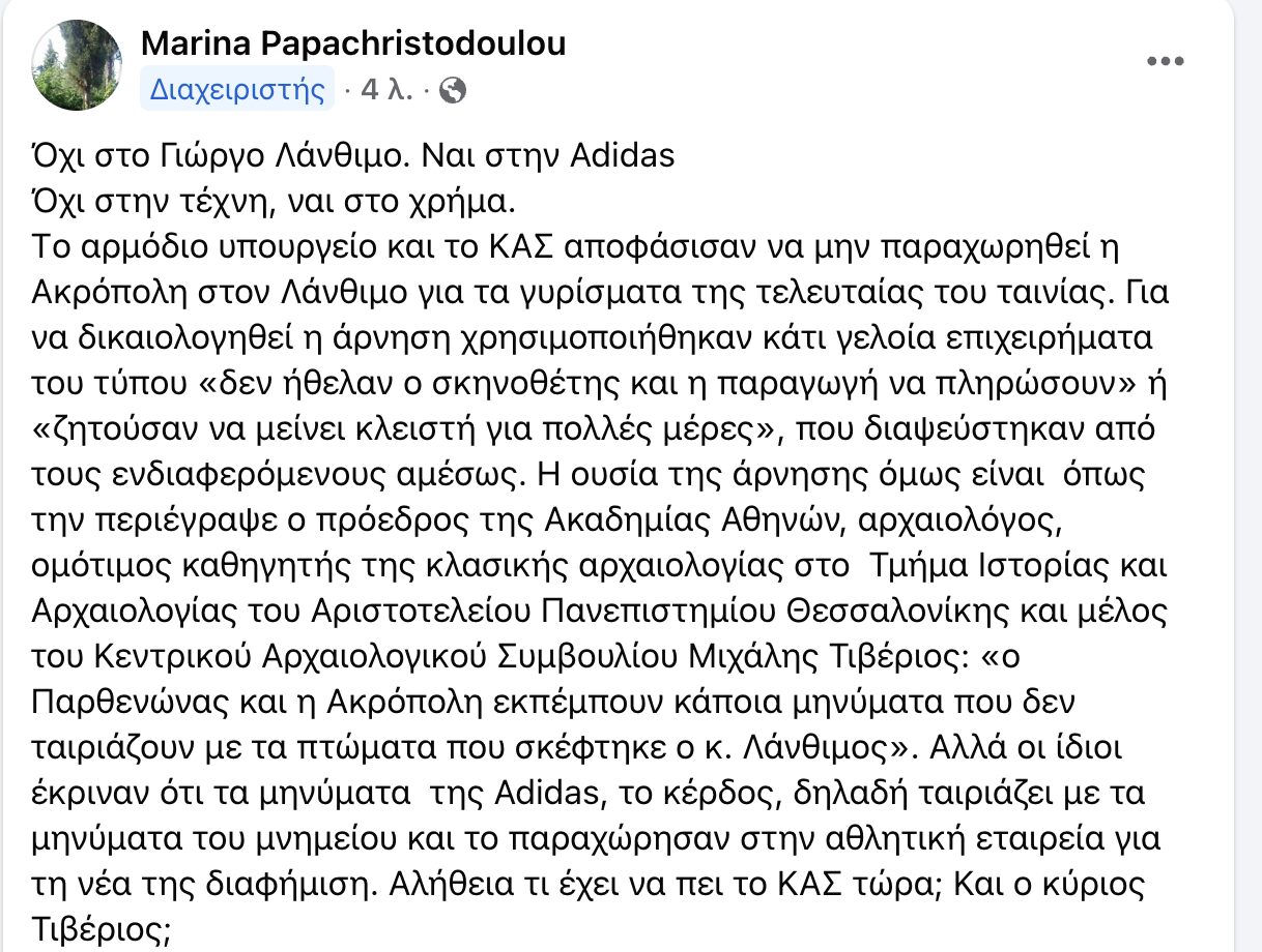 Διευκρινίσεις γύρω από το θέμα με τη διαφημιστική καμπάνια γνωστής εταιρείας αθλητικών ειδών με το drone show με φόντο την Ακρόπολη, έδωσε η υπουργός Πολιτισμού Λίνα Μενδώνη, μιλώντας το μεσημέρι της Παρασκευής (16/5) στο ραδιόφωνο του ΣΚΑΪ.
