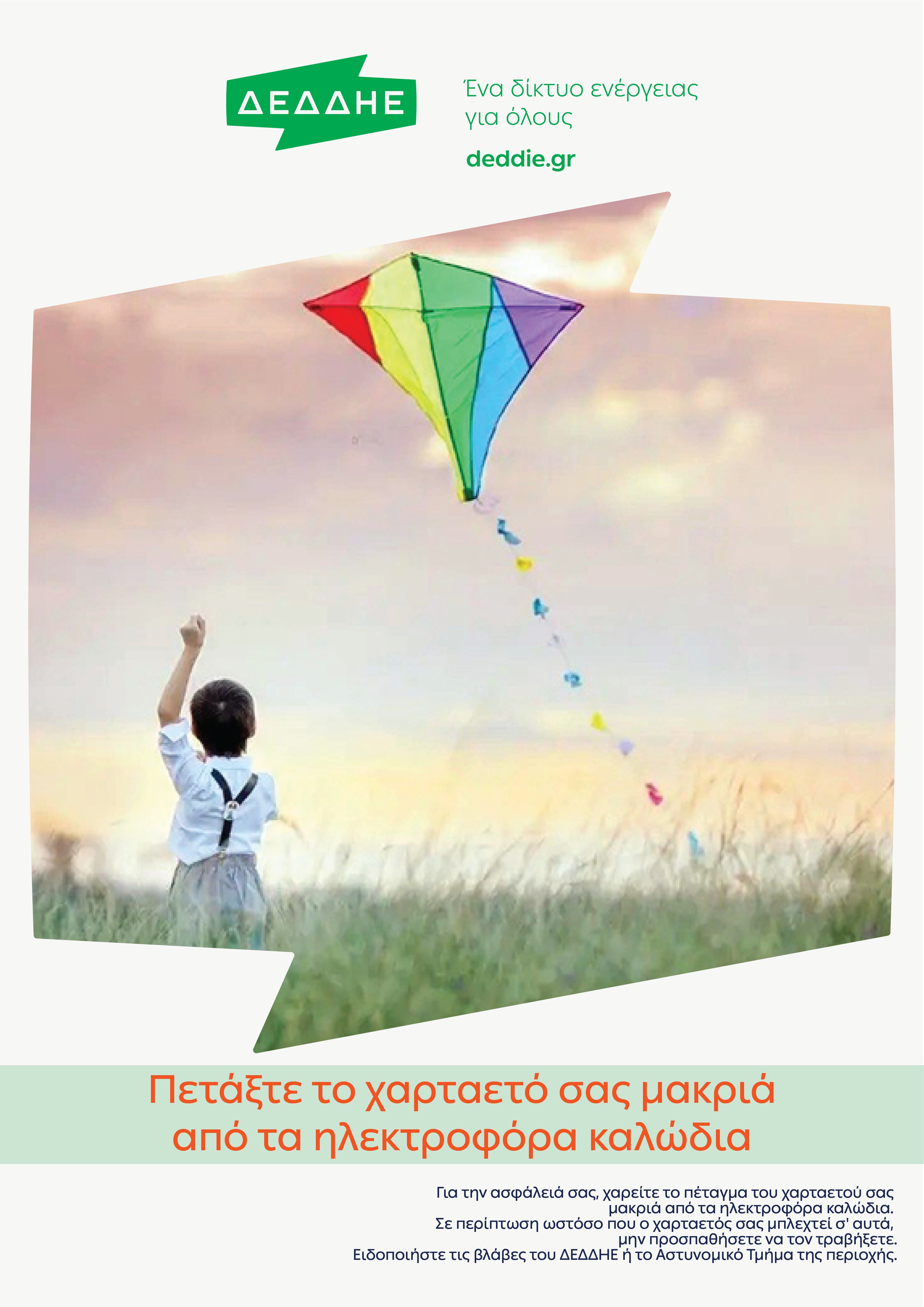 Ο Διαχειριστής Ελληνικού Δικτύου Διανομής Ηλεκτρικής Ενέργειας (ΔΕΔΔΗΕ), σας συμβουλεύει να μην πετάτε το χαρταετό σας κοντά σε ηλεκτροφόρα καλώδια, καθώς υπάρχει σοβαρός κίνδυνος ηλεκτροπληξίας για εσάς και διακοπής της παροχής ρεύματος στη γύρω περιοχή.