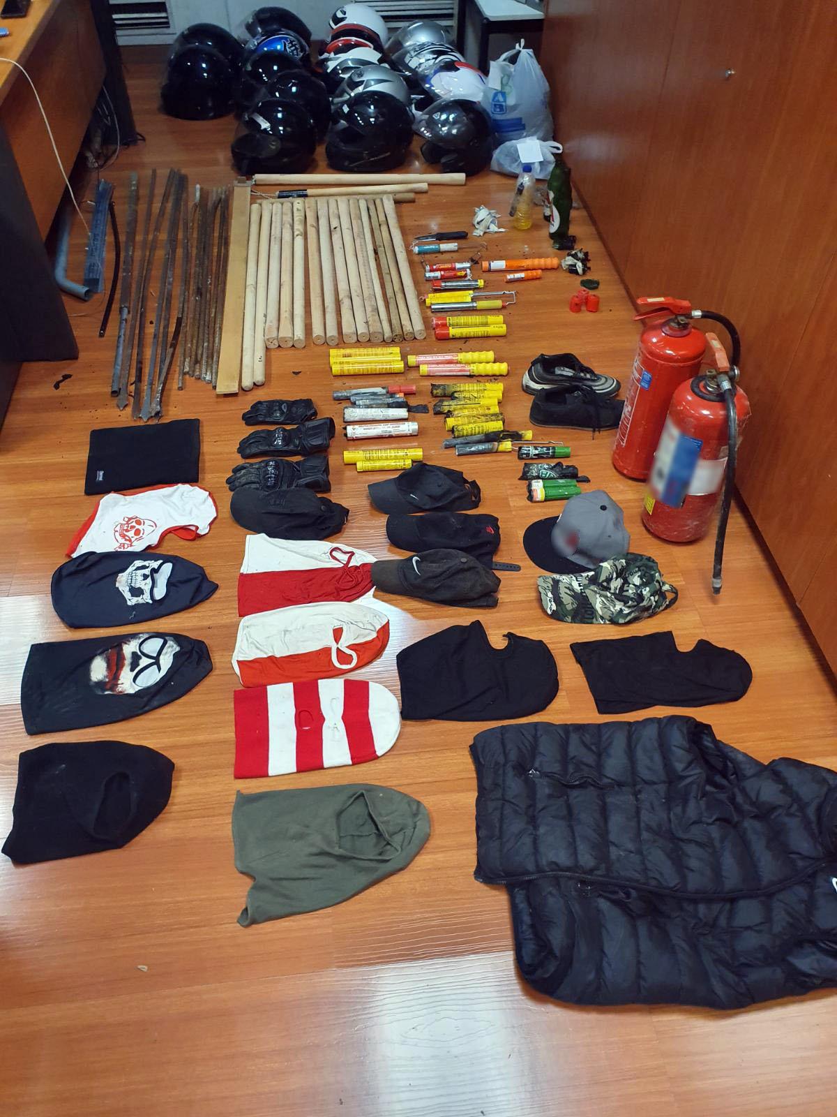 Κατά τη διάρκεια της συμπλοκής, έγιναν ρίψεις φωτοβολίδων ευθείας βολής, αυτοσχέδιων εμπρηστικών μηχανισμών και πετρών, ενώ χρησιμοποιήθηκαν στειλιάρια, σίδερα, μαχαίρια καθώς και άλλα αντικείμενα.