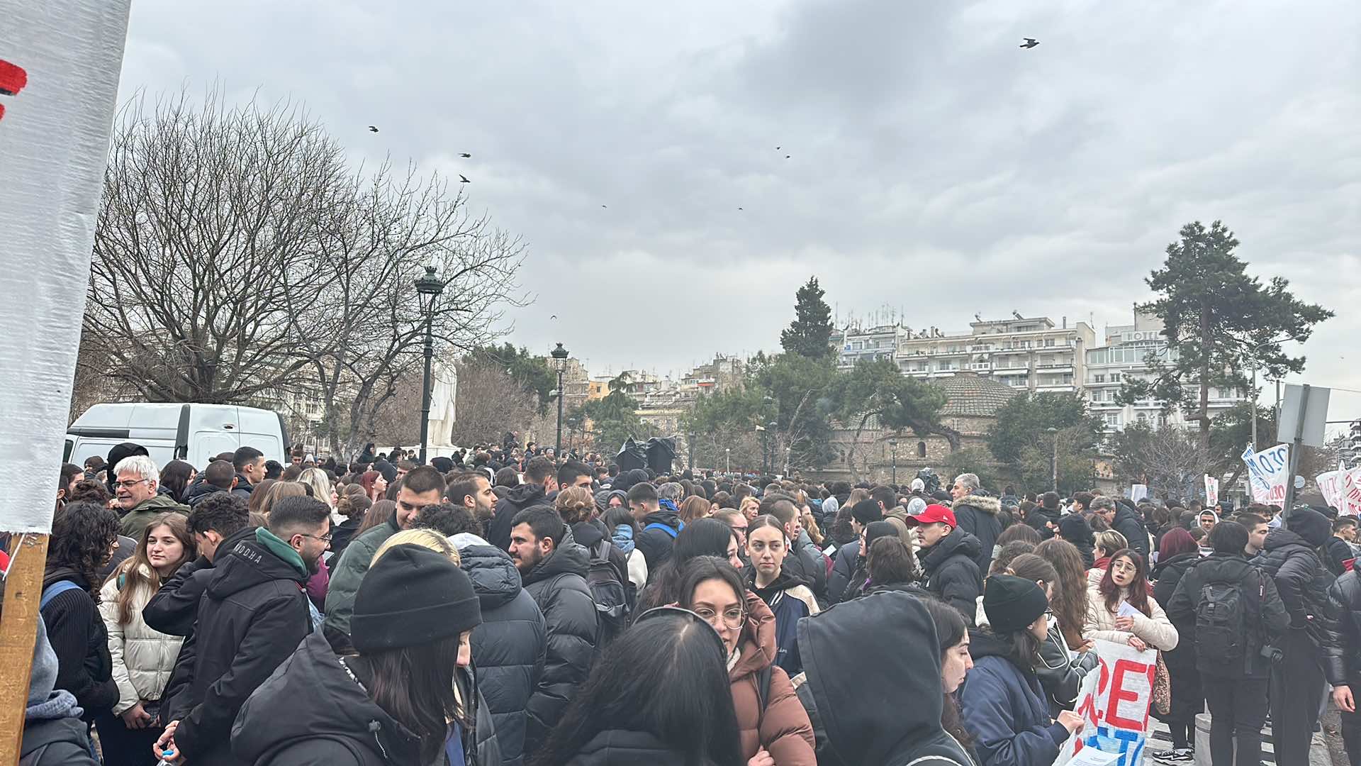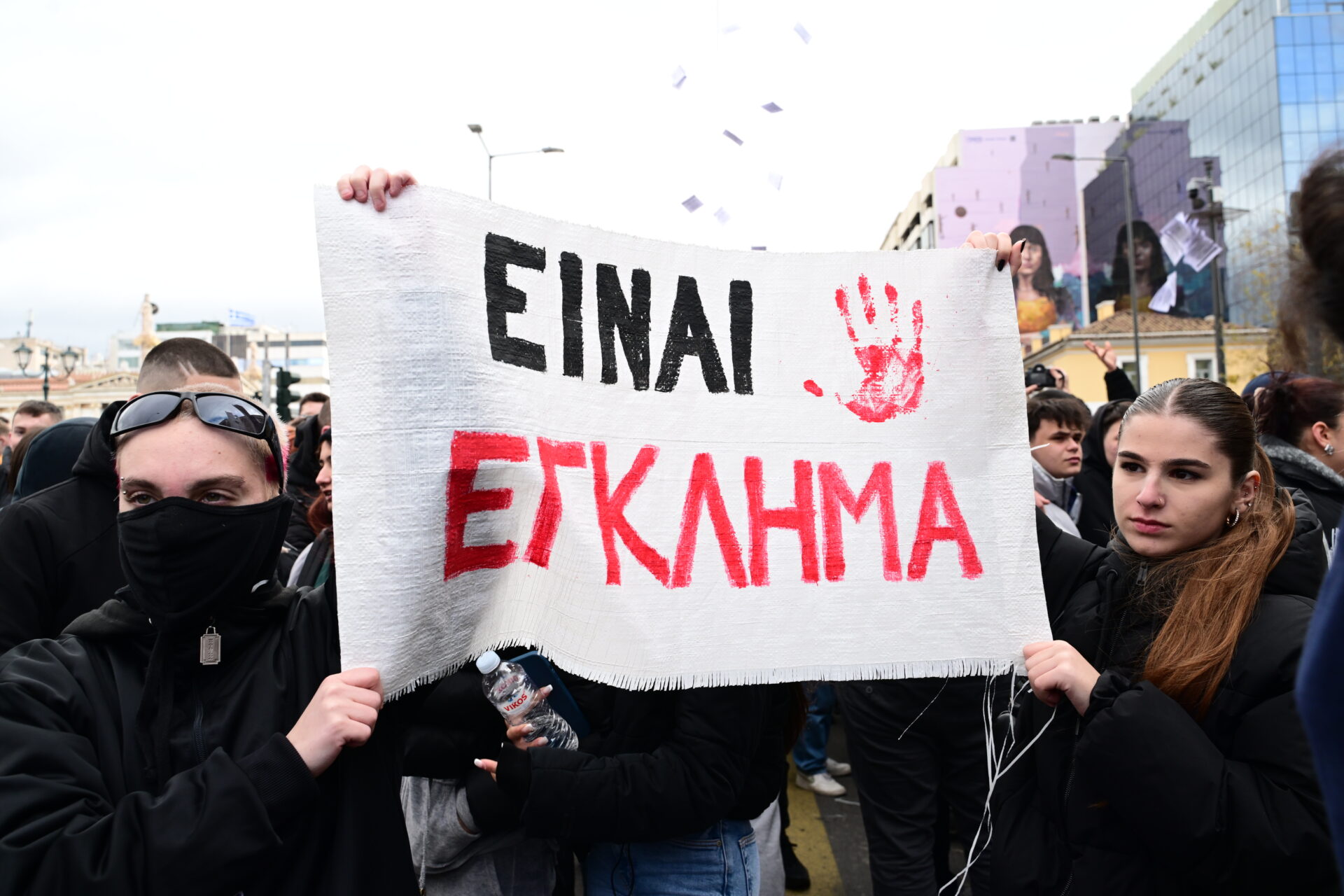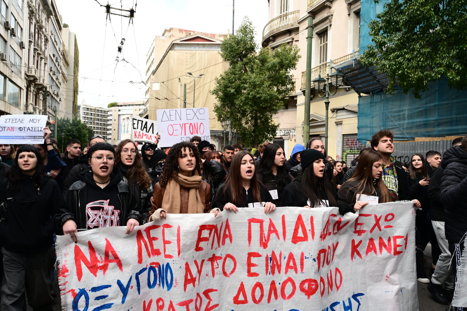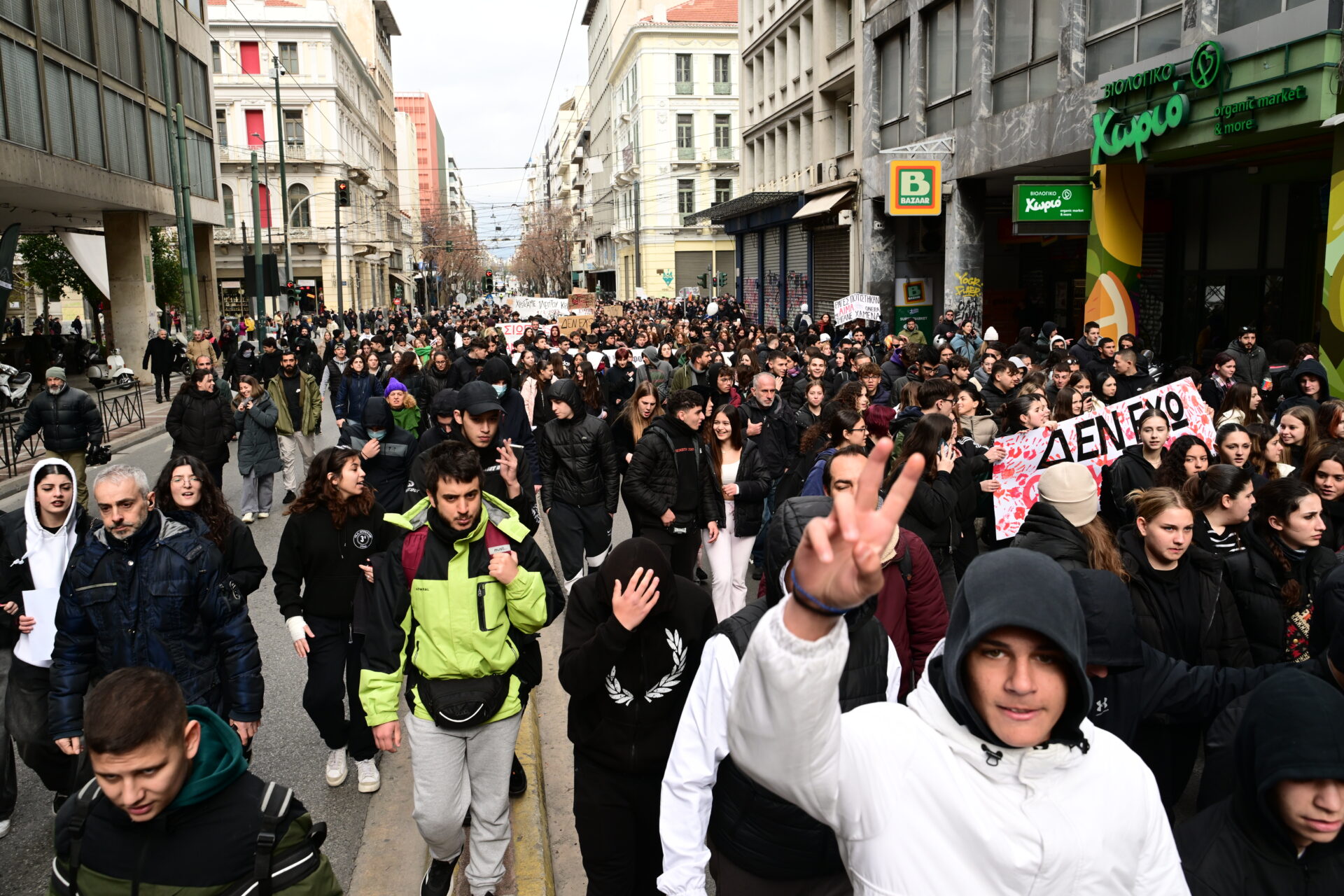 Οι μαθητές και οι φοιτητές συγκεντρώθηκαν στα Προπύλαια και πραγματοποιούν πορεία προς την Πλατεία Συντάγματος.