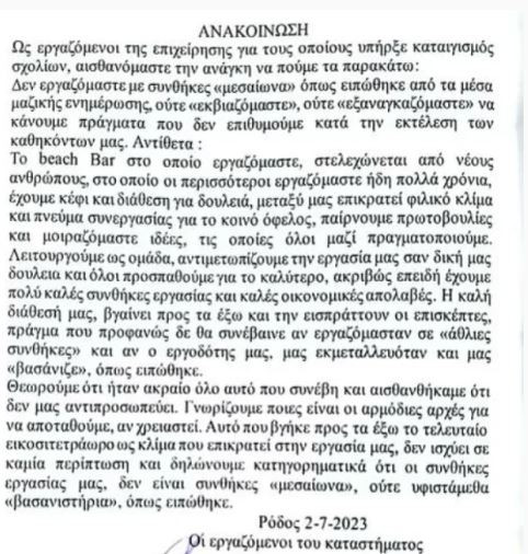 Για «πολύ καλές συνθήκες εργασίας» και «καλές οικονομικές απολαβές» κάνουν λόγο στην ανακοίνωσή της οι εργαζόμενοι. Μετά τη «θύελλα» αντιδράσεων και τον καταιγισμό σχολίων στα social media, οι εργαζόμενοι στο γνωστό beach bar στη Ρόδο έβγαλαν ανακοίνωση, επισημαίνοντας πως «ούτε εκβιαζόμαστε ούτε εξαναγκαζόμαστε να κάνουμε πράγματα που δεν επιθυμούμε κατά την εκτέλεση των καθηκόντων μας».