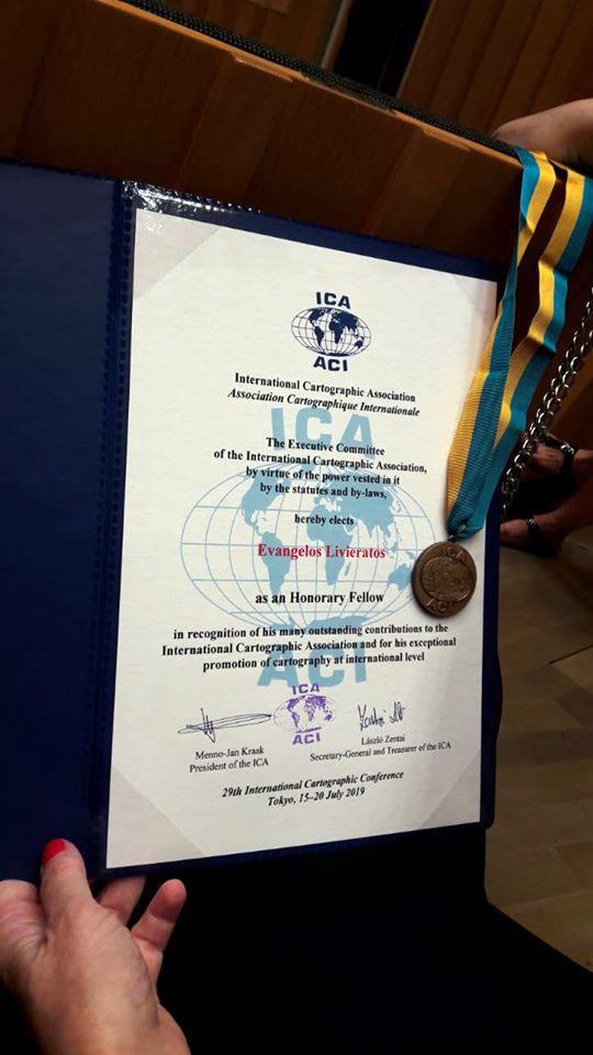 Η Εκτελεστική επιτροπή της ICA απένειμε με ομόφωνη απόφαση των μελών της στον καθηγητή Ευάγγελο Λιβιεράτο τον τίτλο του Επίτιμου Εταίρου (Honorary Fellowship), σε ειδική τελετή που πραγματοποιήθηκε στο 29ο Παγκόσμιο Χαρτογραφικό Συνέδριο, στο Τόκιο.