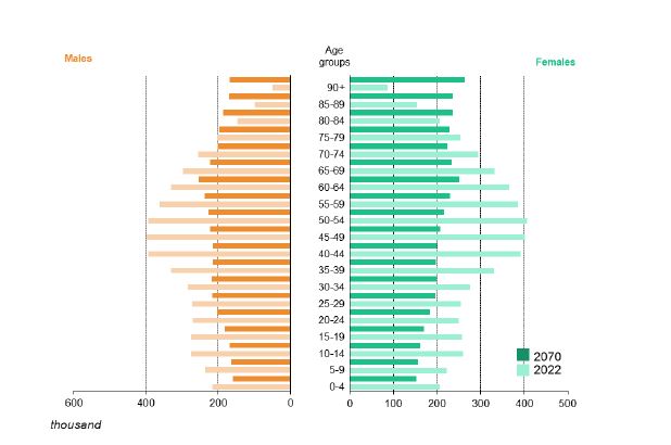 Το ακόλουθο γράφημα δείχνει τη σύγκριση της ηλικιακής πυραμίδας μεταξύ 2022 και 2070 για άνδρες και γυναίκες.