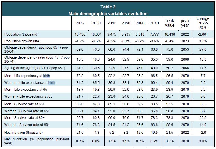 Η εκτίμηση για την εξέλιξη των κύριων δημογραφικών μεταβλητών παρουσιάζεται στον ακόλουθο πίνακα. Ο πληθυσμός , όπως προβλέπεται από τη EUROSTAT, μειώνεται από 10,438 εκατομμύρια το 2022 σε 7,777 εκατομμύρια το 2070.