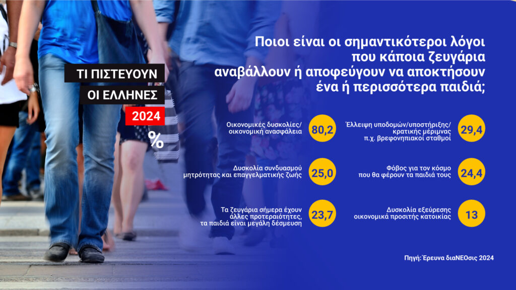 Όσον αφορά στα αίτια της υπογεννητικότητας, αυτά τα αποκαλύπτουν τα θύματα της πολιτικής που τα γεννά. Συγκεκριμένα, σε μεγάλη δημοσκοπική έρευνα την οποία διεξήγαγε η ΔιαΝΕΟσις, το 80,2% των νέων της χώρας μας δηλώνει ότι δεν προχωρά σε τεκνοποίηση επειδή δεν μπορεί να το κάνει λόγω φτώχειας.