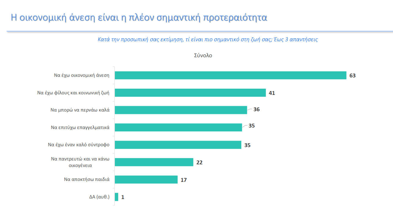 Η οικονομική άνεση φαίνεται πως αποτελεί την πιο σημαντική προτεραιότητα για τους συμμετέχοντες. Αντίθετα, ο γάμος και η δημιουργία οικογένειας είναι έκτα κατά σειρά, ενώ η απόκτηση παιδιών βρίσκονται στην έβδομη θέση.