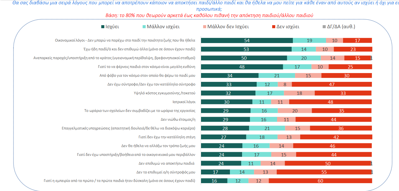 Όσον αφορά τους βασικούς αποτρεπτικούς λόγους για την απόκτηση παιδιών, κυριαρχούν οι οικονομικοί λόγοι, η ανεπαρκής στήριξη του κράτους και η μεγάλη ευθύνη που συνεπάγεται το να φέρνεις παιδιά στον κόσμο.